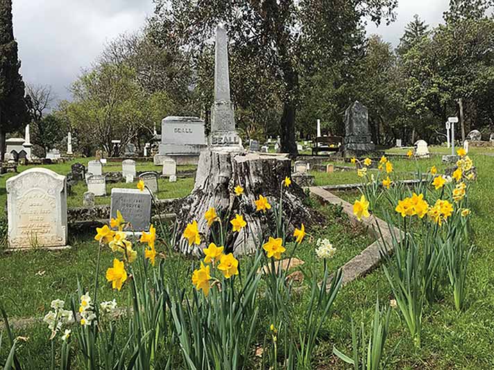 MAY BRINGS MANY EVENTS—After an unusually cold and wet winter, it’s time at last for a busy season of outdoor events at Jacksonville’s Historic Cemetery! Our recurring History Saturday in the Cemetery and Marker Cleaning Workshop programs, plus the annual Pre-Memorial Day Community Cemetery Clean-up and Flags for our Veterans events make May a very full month. All are great ways to enjoy the spectacular weather and beauty of springtime in Southern Oregon!